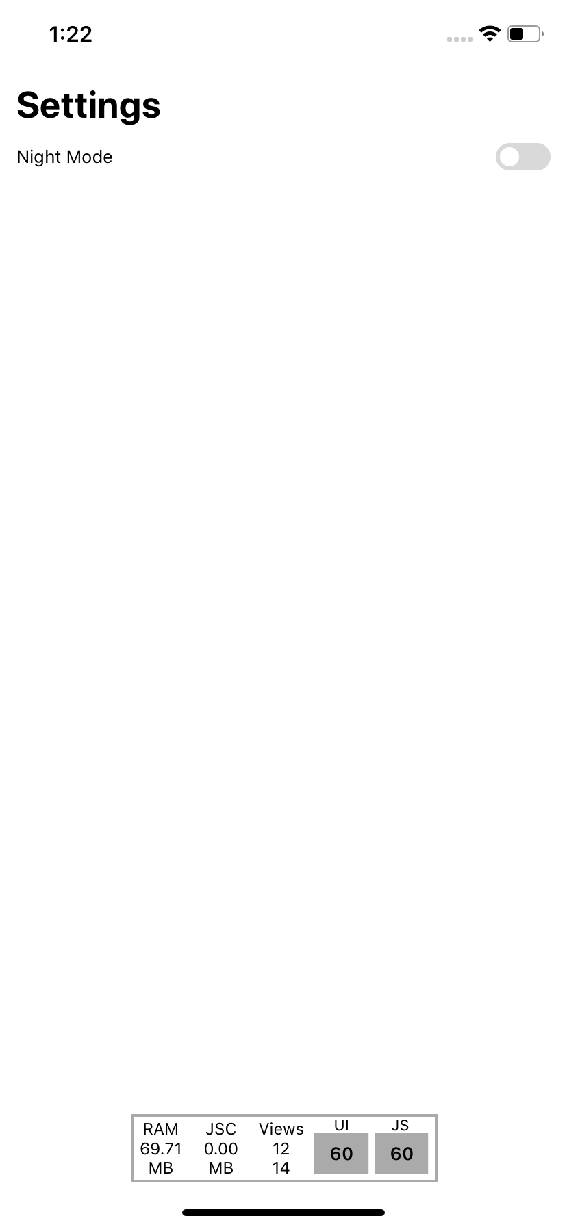 <Div bg="body" flex={1} px="lg"> <Text mt="2xl" pt="xl" fontSize="5xl" color="text" fontWeight="bold"> Settings </Text> <Div row mt="md"> <Div flex={1}> <Text color="text">Night Mode</Text> </Div> <Div> <ThemeSwitcher /> </Div> </Div> </Div> </ThemeProvider>